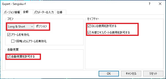 - タブ「全般」で自動売買が行えるよう各種設定をします。